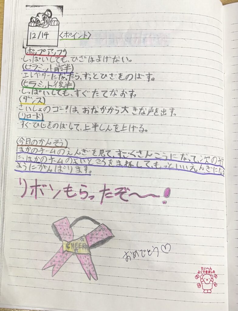 ハーティーズでは、**自主練習の内容やレッスンの振り返りを自分の言葉で記入する「チアノート」**の取り組みを行っています。
